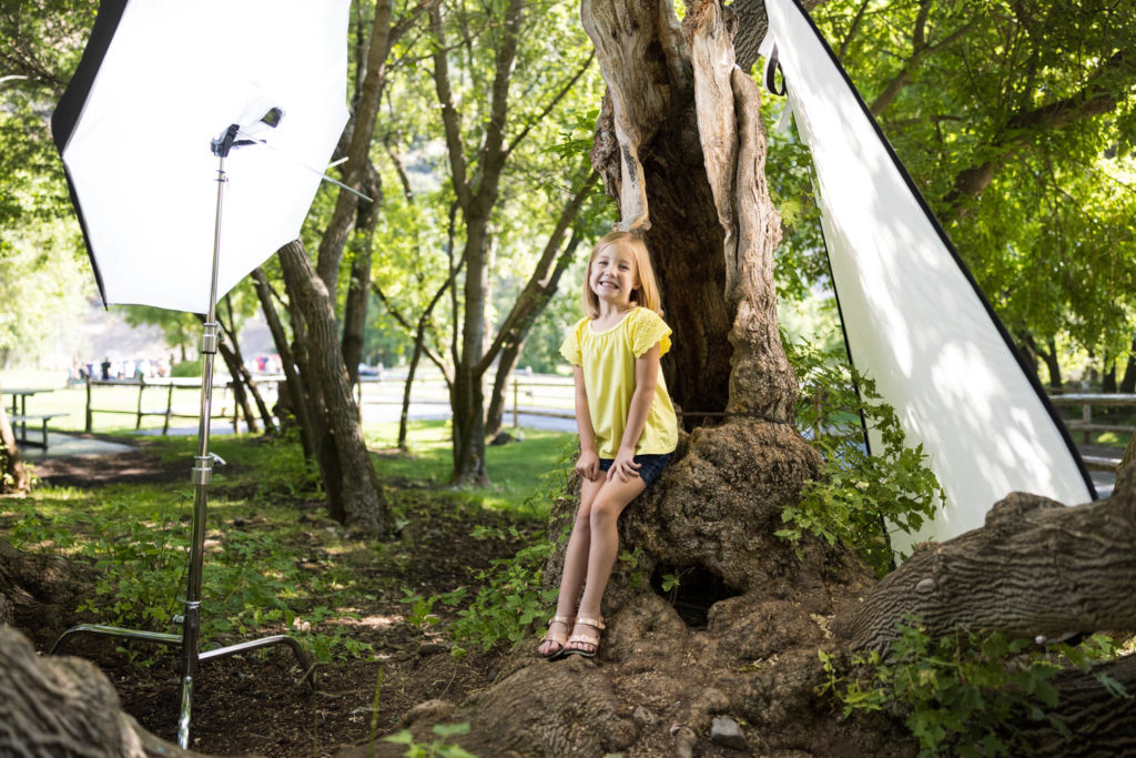 Here we have a behind the scenes of Molly. We have my main light on the left, and then I have a diffuser that is softening the sunlight on the right. Lately I have been loving shooting in shade with sunlight coming from behind, but we needed a different angle and I wanted to avoid the dappled lighting on Molly, James, and Arthur.