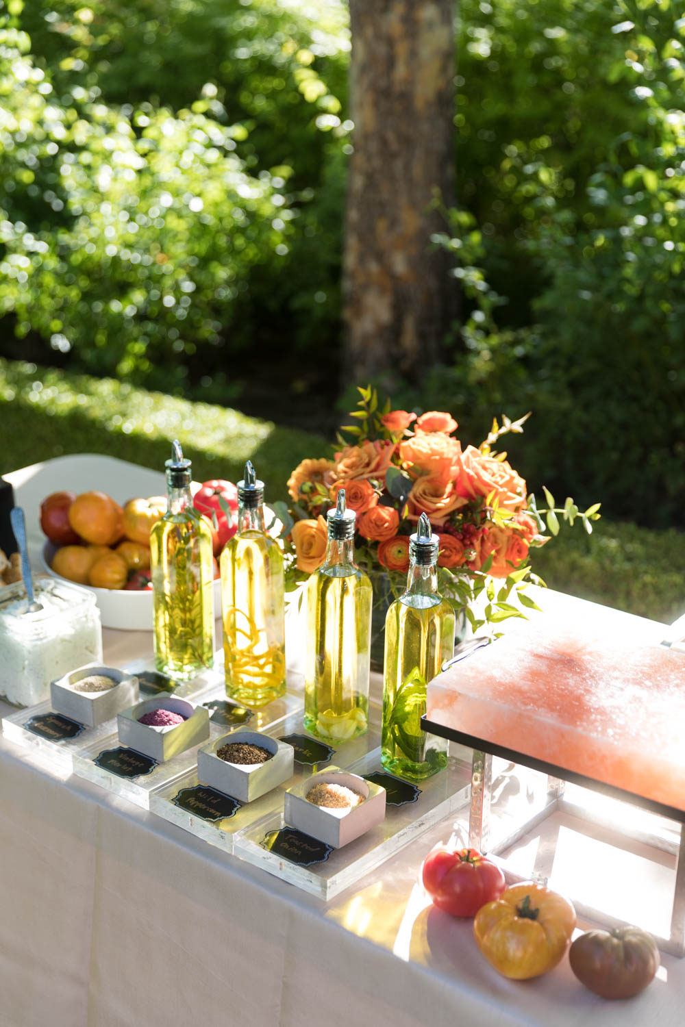 Caprese bar with infused oils and different saltsIt was fun to photograph the rosemary infused olive oil. It can be a challenge photographing oils and reflective objects.